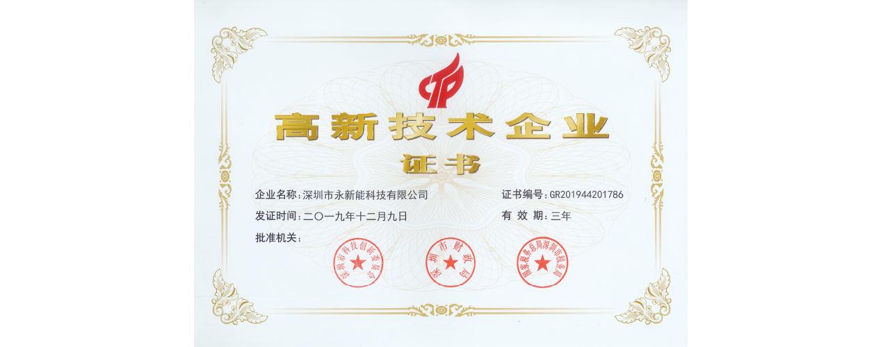 近日,深圳市永新能科技有限公司(简称“永新能”)收到了由深圳市科技创新委员会、深圳市财政局、国家税务总局深圳市税务局联合颁发的《高新技术企业证书》(证书编号:GR201944201786),此次通过国家高新技术企业认定,不仅体现了国家对永新能产品创新能力的肯定和未来发展的支持,也是对公司综合实力的认可。