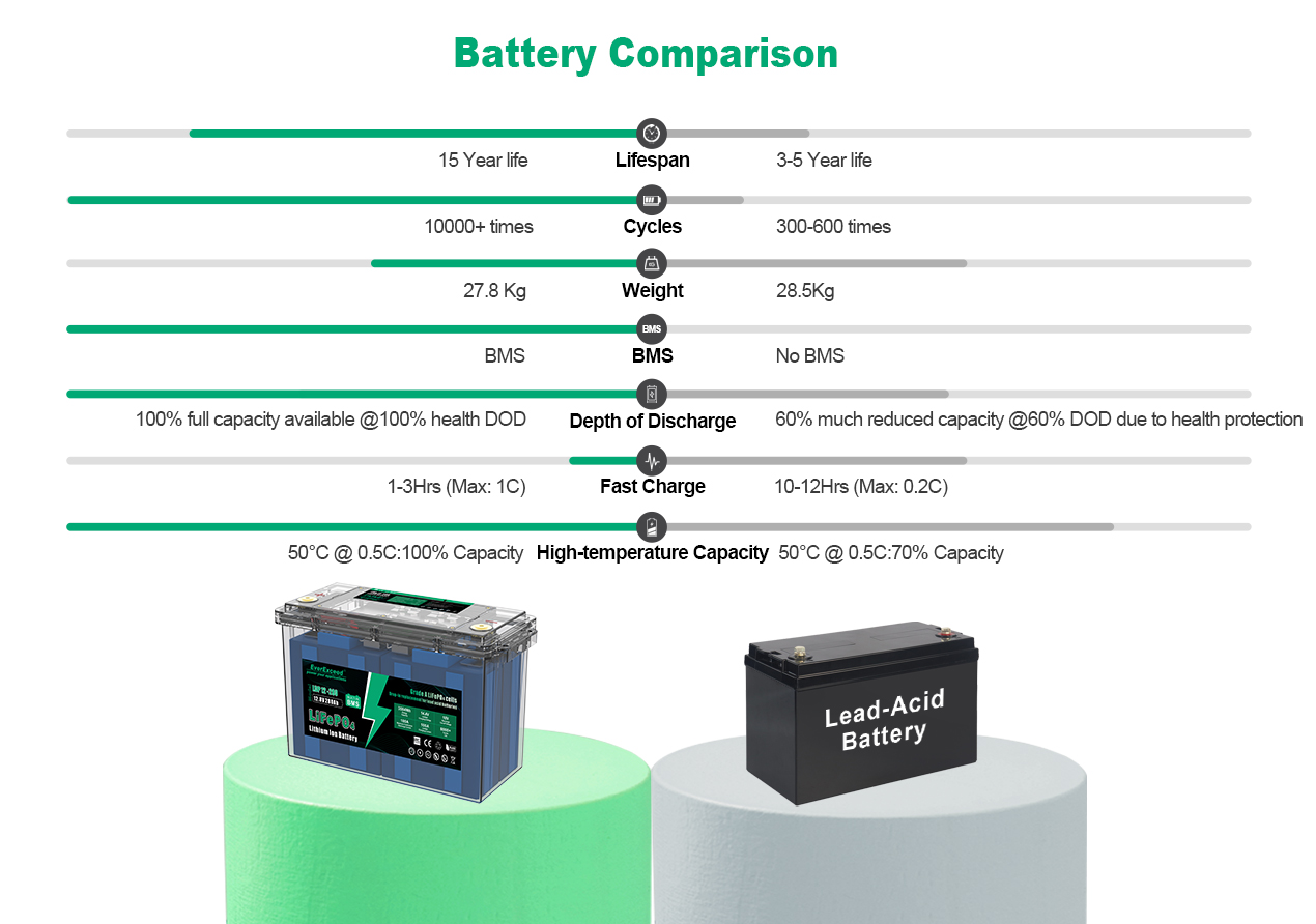 EverExceed LDP系列磷酸铁锂(LiFePO4)电池与同等容量的铅酸电池相比,能够提供更高的效率能量输出。它们能够接受连续的高率充电安培,使电池在短时间内充满,并显著提高负载服务效率。内置的高级BMS确保智能自动保护,防止过压、过流、过放、过热。